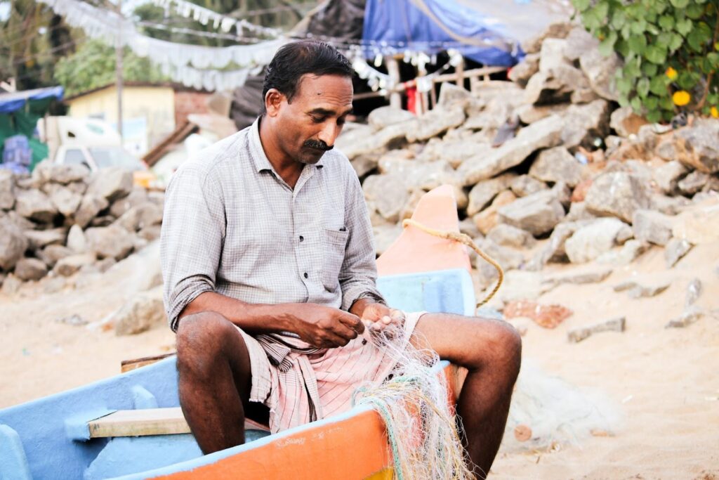 Majeed, the fisherman, skillfully tending to his net, crafting stories with every knot against the backdrop of the vast sea.