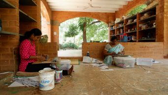 Women artisans Sudha and Rani, making the handicraft products.