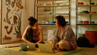 Volunteers Nusha and Fiona are having a conversation.